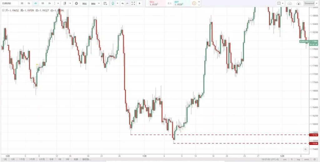 这是USDCHF的4小时K线图,时间是2017年11月7号,前面已经有一个低点,是支持位了,价格是1.1574,做交易的人都知道,支撑位是很关键的,很多人做单,都会把止损位放在支撑位的下方,可能10个点,可能20个点,具体要看个人,但是这一次,价格最低走到1.1553,然后开始反弹往上走的。这个价格很有意思哦,比前低低了21个点,还不是整数的20点。
