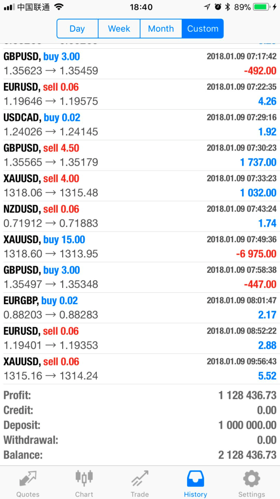 这个账户是100万美金的实盘,从2016年1月4号开始交易,到今天(2018年1月9日),可以看做正好两年,盈利是112.84万,刚刚翻倍。
