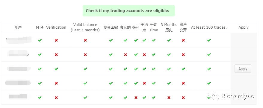 笔者绑定了5个账户,只有中间一个账户过了系统这一关,然后可以申请,申请的时候再给自己的交易策略做一定的描述,如下图:
