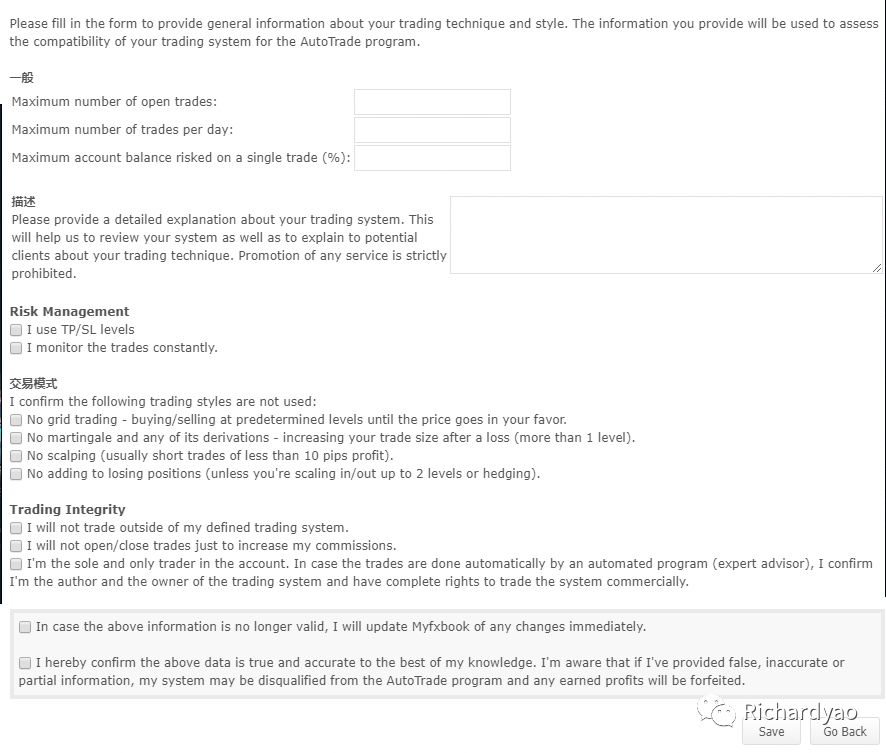 这个环节只有英文,至今不支持中文,英文好的大概看一下,具体的不一一翻译了,就是myfxbook对于信号有严格的要求的,提交之后,人工审核,约一个星期给回复,有邮件过来的,如果被pass,会具体说明原因的,哪一个版块不符合他们的要求。