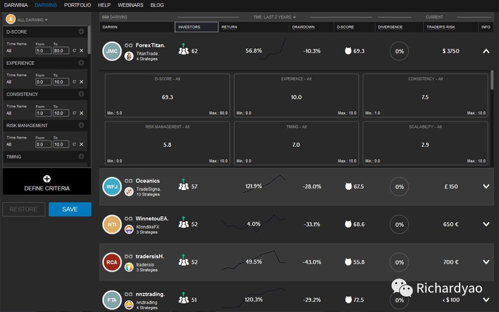 如前文所述,Darwinex的客户,可以买卖DARWINS,列表中列出了客户可以投资的DARWINS(目前超过600个)。客户可以对其中许多属性进行排名,其中包括普遍使用的指标,例如例如累计收益,缩编和投资者数量,以及独特的Darwinex指标(通过其专有算法得分为0到10),这些是经验、一致性、风险管理、时间安排、可伸缩性和性能,D-Score是这六项的摘要。