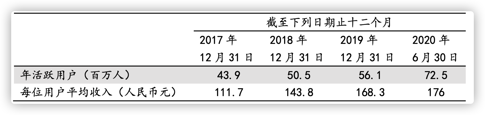 运营数据方面,年活跃用户以及每位用户平均收入均呈现明显的上升趋势。具体数据显示,截至2017年12月31日、2018年12月31日、2019年12月31日以及2020年6月30日止12个月,公司分别拥有43.9百万、50.5百万、56.1百万及72.5百万个年活跃用户;每位用户的平均收入分别为111.7元、143.8元、168.3元以及176元。