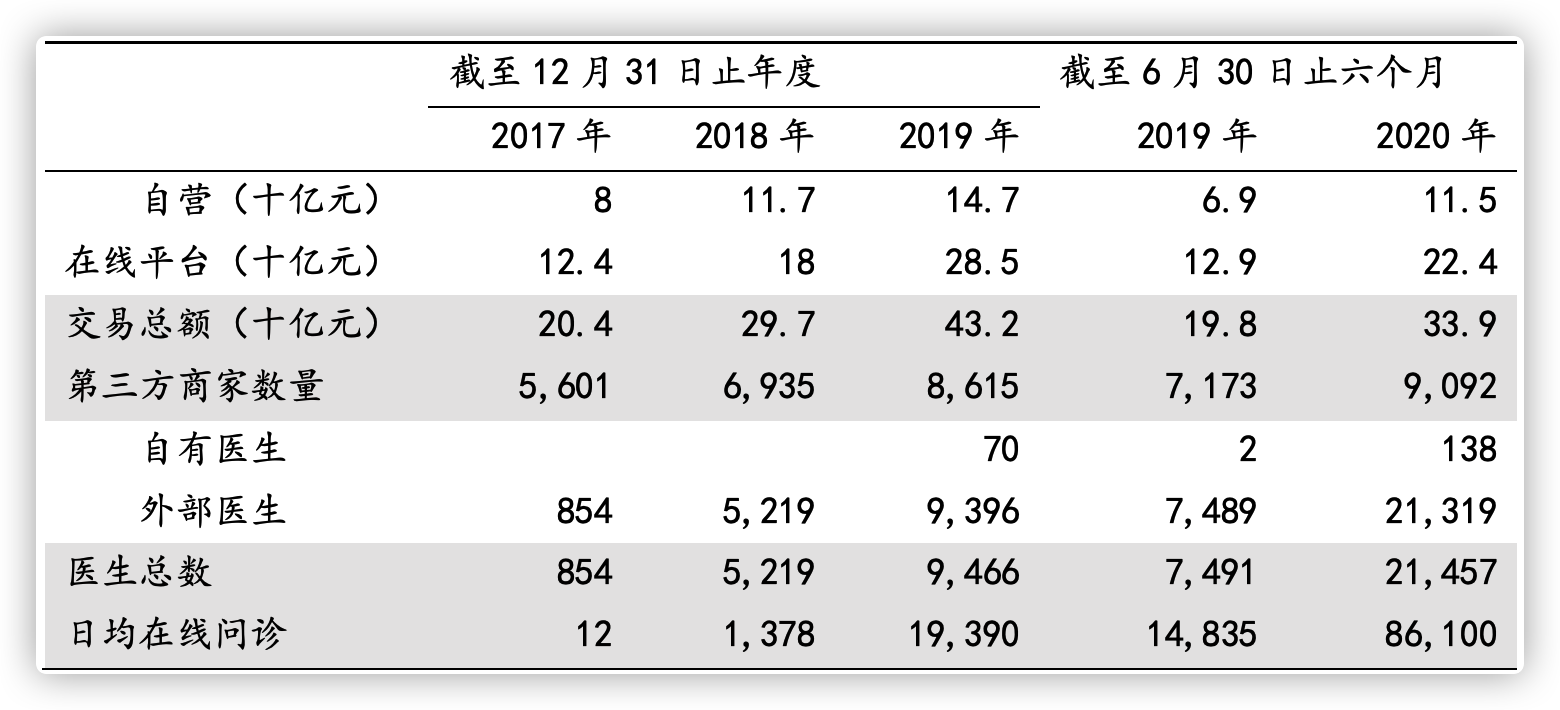平台交易额以及医生数量快速增长。具体数据显示,于2017年、2018年及2019年以及2019H1、2020H1,京东健康平台的交易额分别为204亿元、297亿元、432亿元以及198亿元、339亿元;医生总数分别为854位、5,219位、9,466位以及7,491位、21,457位;第三方商家数量分别为5,601个、6,935个、8,615个以及7,173个、9,092个;日均在线问诊的频率分别为12次、1,378次、19,390次以及14,835次、86,100次。