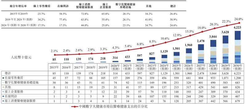 服务收入主要来自:1)在线平台经营,主要向在线平台的第三方商家收取佣金及平台使用费;2)提供数字化营销服务,向第三方广告主收取数字化营销服务费。于往绩记录期间,在线医疗健康服务(包括互联网医院服务及消费医疗健康服务)收入占总收入的很少一部分。因此,在线医疗健康服务收入被归入数字化营销及其他服务的一部分。
