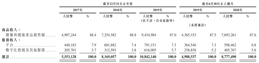 于2017年、2018年及2019年以及截至2019年6月30日及2020年6月30日止六个月,零售药房业务产生的收入占总收入的大部分,其中:1)医药和健康产品销售收入占总收入的比重分别为88.4%、88.8%、87.0%、87.5%及87.6%;2)平台服务收入占总收入的比重分别为7.9%、7.4%、7.3%、7.3%及6.8%。