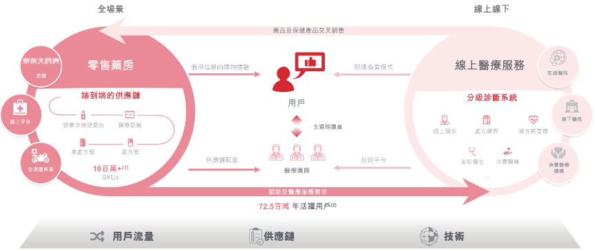 业务模式上,京东健康的业务主要有两部分:零售药房和线上医疗服务。根据弗若斯特沙利文报告,于2019年按收入计,京东健康是中国最大的在线医疗健康平台,录得总收入108亿元(人民币,下同),亦是中国最大的在线零售药房,市场份额为29.8%。公司致力于打造以医药及健康产品供应为核心,医疗服务为抓手,数字驱动的用户全生命周期全场景的健康管理平台。
