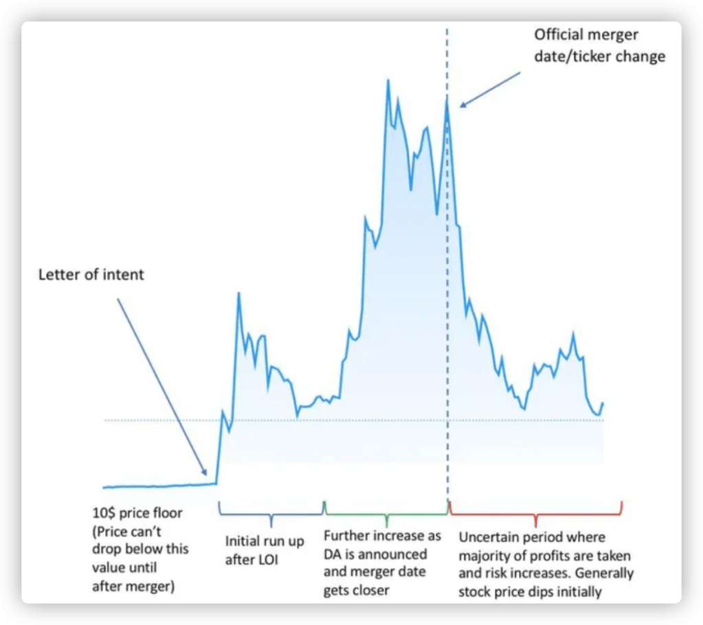 这里上一个图,一个能够正常完成并购的SPAC股价大概是如下的走势: