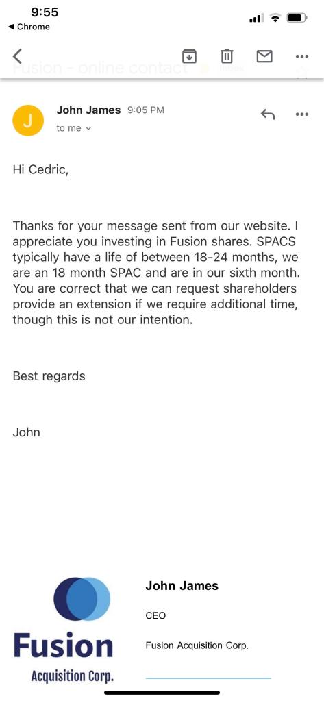 虽然FUSE上市的时间不算长,但是按前面的分析,应该不会等到快到清算期,不过前些天有海外的网友发邮件给FUSE询问情况,CEO John James亲自回复了邮件,但是回复比较官方,这也可以理解,作为公司CEO,肯定不能轻易透漏为确定的事情出来。