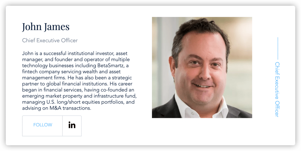 公司的CEO兼董事John James具有超过20年的机构投资经验,也是资产经理以及多种技术业务的创始人和运营商。 他2015年创立了BetaSmartz,这是一家为金融服务组织服务的全球金融技术公司,自2015年11月以来一直担任其董事长兼首席执行官。 在此之前, 他在2005年与他人共同创立了新兴市场基金管理和主权咨询公司Boka Group,他负责监督Boka的投资和基金管理,直到2010年Boka的封闭式基金期限结束。2010 年,James 移居澳大利亚,开始构建新的金融产品,包括为 黑石集团的子公司La Trobe Financial Services提供的首套购房者抵押贷款产品,以及房地产交易所交易基金 (“ETF”)。