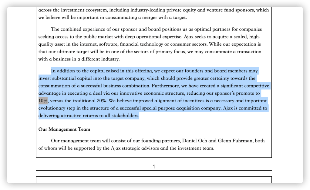 第三个,AJAX的保荐人承销比例是10%,而不是正常的20%,这大大缩小了收购方在新公司的占股比例。可以说AJAX给打了一个大折扣。