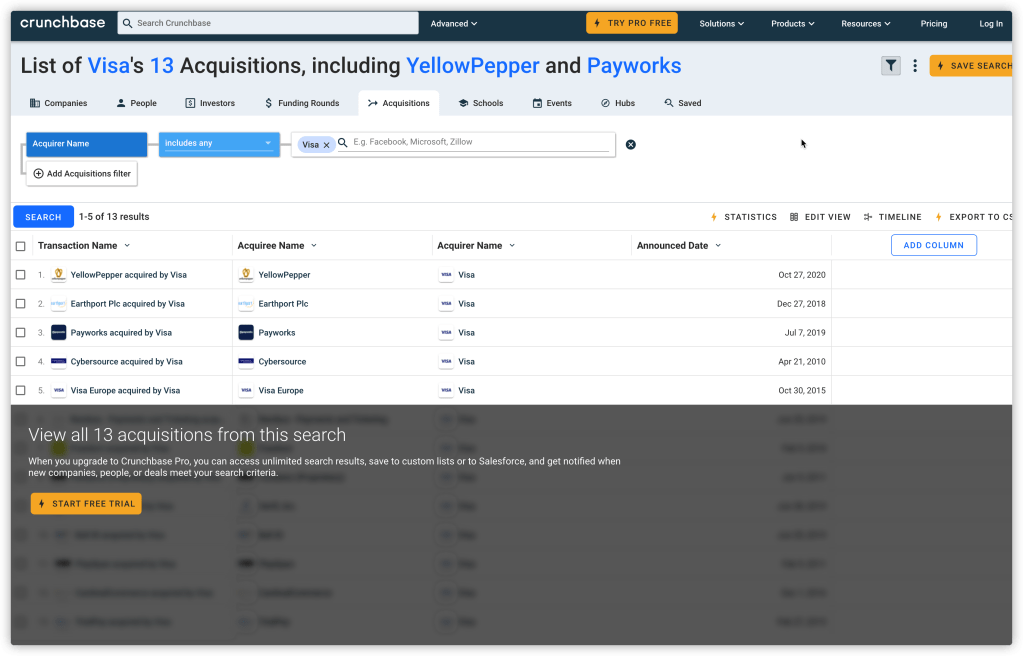 那么是不是接近5000亿美元市值的Visa被美国政府针对了呢?其实并没有。Visa这些年的收购一直没有停过,见下面这个图,链接这里放上:https://www.crunchbase.com/search/acquisitions/field/organizations/num_acquisitions/visa