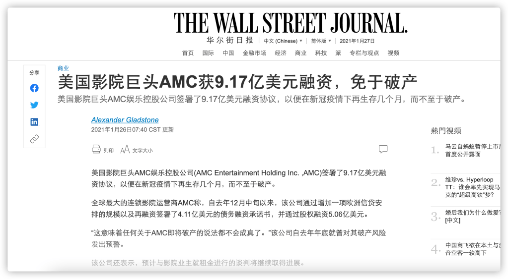 此后,AMC在融资的路上不留余力,去年12月,AMC出售了2亿股现有股份中的3800万股后筹集了1.04亿美元资金,并获得了Mudrick Capital Management的1亿美元投资。AMC还希望通过出售5000万股股票来筹集1.25亿美元的新一轮资金。1月19日,AMC又宣布发行2026年到期的1亿美元担保债券。