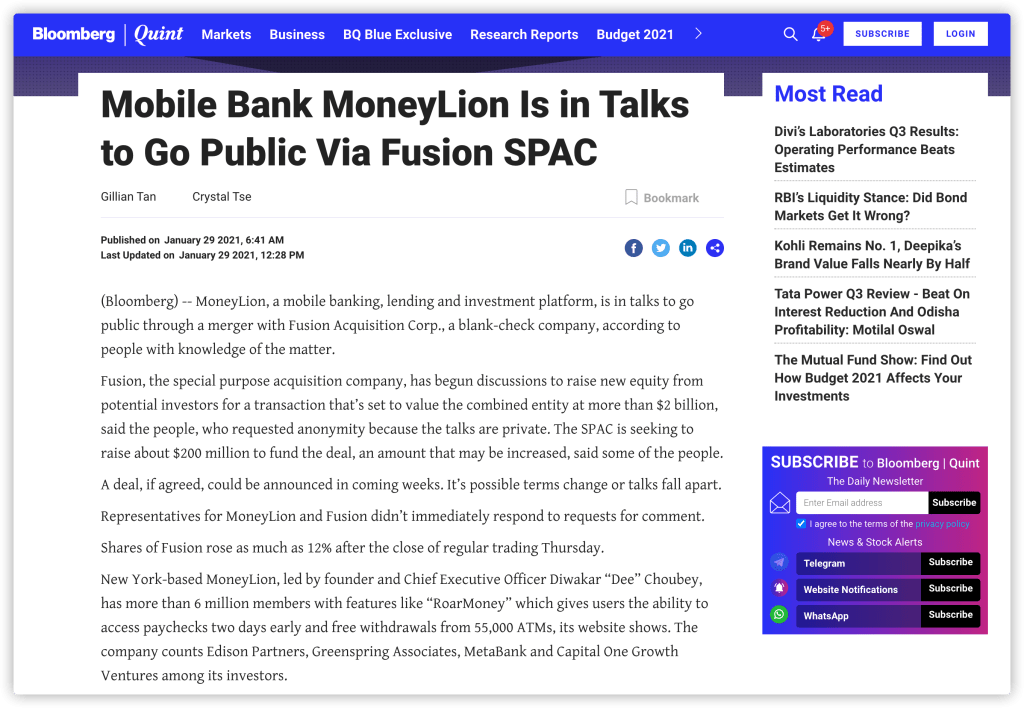 上个月低,具体时间是1月29号,彭博社发了一遍报道,说:移动银行MoneyLion正在商谈通过Fusion SPAC上市。