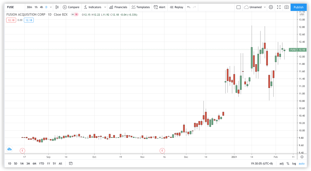 回到股价上,现在的价格是12.18美元,虽然彭博社的报道有一周多了,但是股价对比那些非常热门的SPAC来说,涨幅只有20%多,其实还好,并不多。参考前面IPOE最高涨到28美元多,然后回落到目前的23,市场对FUSE的热情可能没有那么高,第一波的涨幅可能到18美元、20美元就差不多了。至于第二波,现在不好判断。