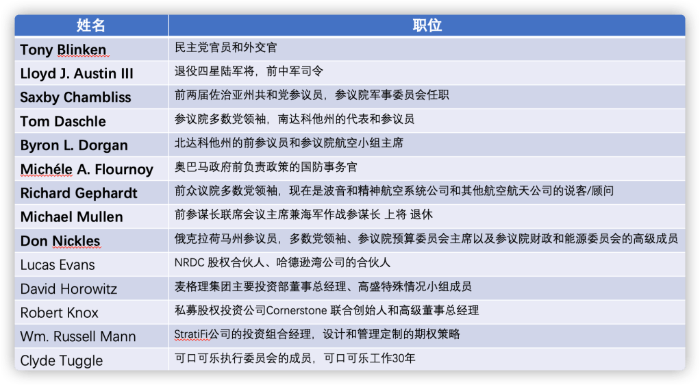 可以看到,在写进招股书里的十四位合作伙伴里,有高达九位是在政府、军队任职过的要员,都是举足轻重的人物,包括前参众两院多数党领袖,和前参谋长联席会议主席,国防和参议院航空小组副秘书。其中还有一两个是被拜登提名为新一届政府的国务卿和国防部长。