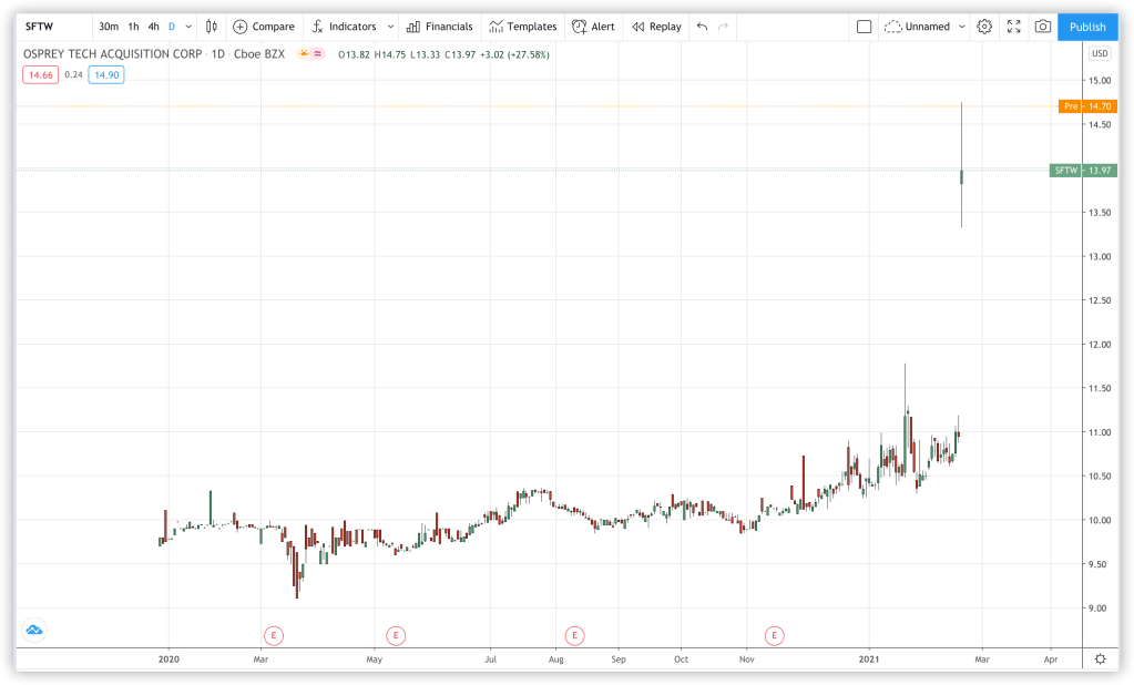 那我们来看一下SFTW的股价,昨天官宣合并之后,股价直接从11美元直接跳开到了13.8美元附近,最高到达14.75美元,收盘在13.97美元。
