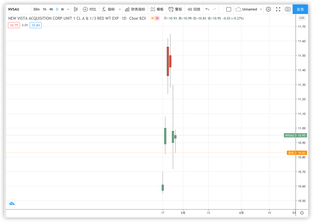 而NVSA的单位就是含了1/3份认股权证。有些人继续问,那买正股还是买单位呢?其实无所谓,一个是商品,一个是商品增加了一个附件,这个附件也是有价值的。如果不需要要这个附件,就买正股吧,但是像这种没拆分的,就只有打包出售一个选择项,如果想买,那就买吧,反正也就贵那么一点点,不影响。