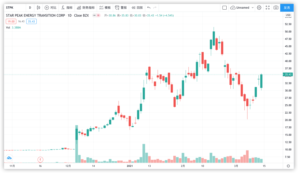 STPK官宣合并已经有一段时间了,去年12月4号就已经官宣了,合并的目标是Stem,到现在三个多月了,应该接近合并完成。并且STPK的股价一直走的不错,从12月4号官宣之后,一直上涨的稳健,并没有出现大部分SPAC官宣之后股价下跌的情况,在2月中旬,最高涨到51.5,上上周也是回撤比较大,最低接近20美元了,好在上周反弹的比较不错。