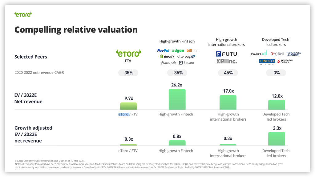 看一下财务数据,2020年eToro收入为6.05亿美元,比2019年增长147%,这是非常惊人的涨幅,但是相对比其他类似同行业的竞争对手,eToro的估值还是相对较低。2020年到2022年,eToro的净收入年复增长率为35%,PayPal、shopify、square这些高增长的金融科技公司也是35%,高增长的国际互联网券商比如富途,则为45%,而那些头部的券商平台,比如盈透,就只有3%了。但是按2022财年的净收入来看,eToro则是最低的,只有9.7倍,PayPal这些是26.2倍,富途是17倍,盈透也还有12倍。可能是eToro所处的赛道还没有得到主流市场的广泛认可,有很多人对于差价合约、数字货币等板块还是有些成见。