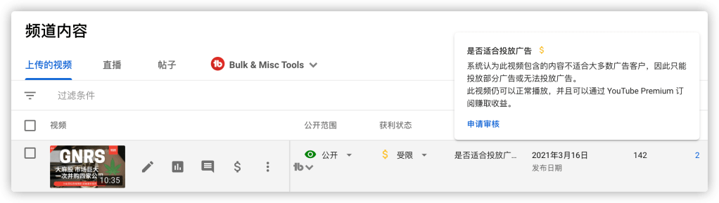 虽然我频道目前的广告收入还基本上忽略,毕竟观看量没有上去,我短时间也没有指望频道的播放量能够很大带来很高的广告收益,但是出现这样一个提示,心理还是有些不爽的。
