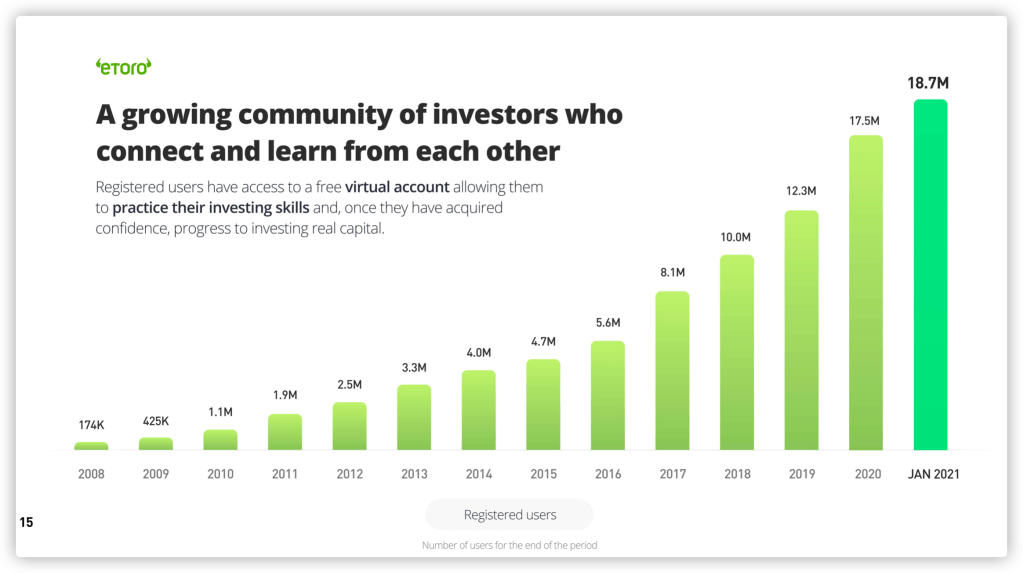 eToro目前拥有超过2000万注册用户,其社交社区正在迅速扩大,因为其庞大且不断增长的总可寻址市场得到了数字财富平台增长和零售参与度上升等世俗趋势的支持。